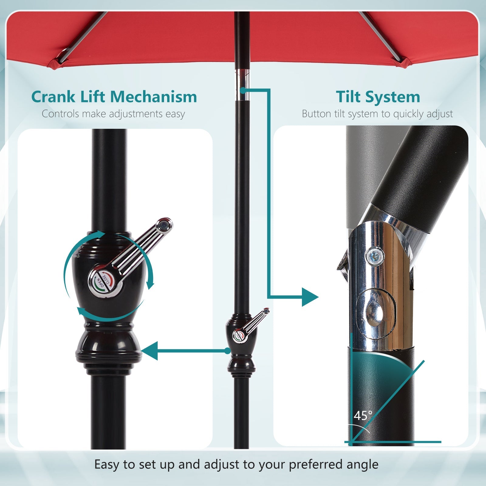 - ?【DURABLE CONSTRUCTION】: The table umbrella is crafted with a sturdy iron frames ensures durability and stability while being lightweight and resistant to rust.The top vented is effective to reduce the wind resistance.Longer lasting lifetime for outdoor.?【EASY OPERATION】: Featuring a crank open system and button tilt mechanism, this market umbrella offers effortless operation, allowing for quick setup and adjustment to achieve the desired shading angles.